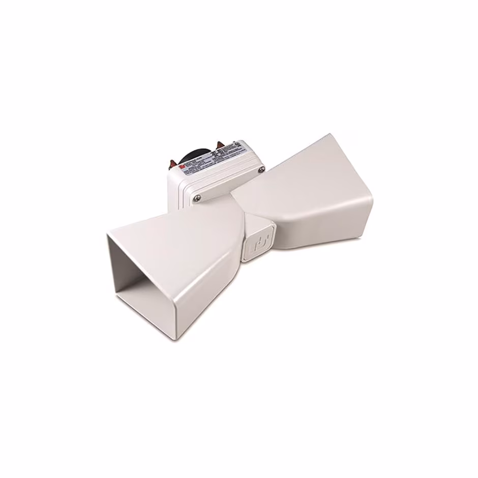 El PR2-NM Double Projector (Gray) es un accesorio tipo horn projector que se instala en bocinas Vibratone® para redirigir la salida sonora a dos direcciones laterales en lugar de proyectarla solo al frente. Esto lo hace especialmente útil cuando necesitas cobertura audible a ambos lados de un punto de instalación, como en pasillos, corredores o áreas lineales.
